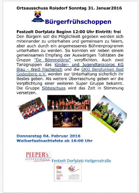 Am Sonntag 31. Januar 2016 Bürgerfrühschoppen (Karnevalistischer Frühschoppen des Ortsauschuss Roisdorf) Beginn 12:00 Uhr Ort: Festzelt Dorfplatz Heilgersstraße Roisdorf