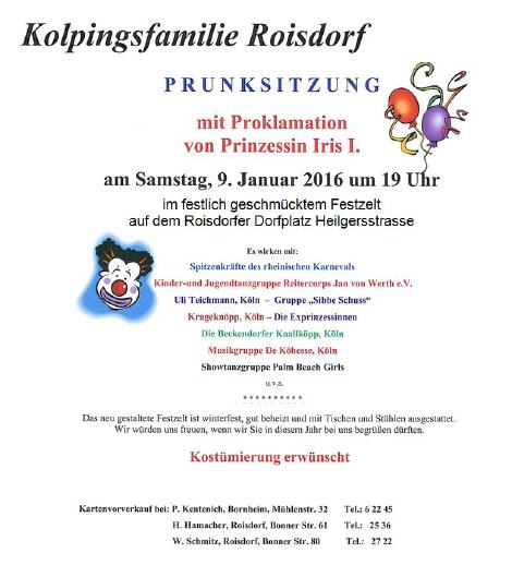 Am Samstag den 9. Januar 2016 Prunksitzung der Kolpingsfamilie Roisdorf mit Proklamation der Prinzessin Session 2015/2016 Einlass 18:00 Uhr Ort: Festzelt Dorfplatz Heilgersstraße Roisdorf