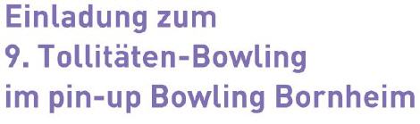 Durch die großzügige Unterstützung des pinup Bowlingcenter Bornheim können wir das karnevalistische Bowlingturnier auch 2016 wiederholen. Nach Super Turnieren in den Vorjahren, möchten wir auch in der Session 2016 diesen Event durchführen.