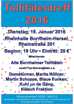 Schon jetzt vormerken: Der Tollitätentreff 2016 findet am Dienstag, 19.01.2016, um 19 Uhr in der Herseler Rheinhalle statt. Weitere Informationen folgen! Ihre Eintrittskarten können Sie schon jetzt reservieren bei Karin Schumacher-Lambertz unter Telefon 0228/945 212 oder Karin.Schumacher-Lambertz(at)stadt-bornheim.de.
