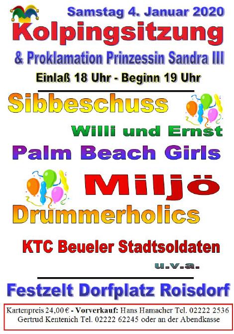 Am Samstag den 4 Januar 2020 Prunksitzung der Kolpingfamilie Roisdorf mit Proklamation der Prinzessin Session 2019/2020 Einlass 18:00 Uhr
