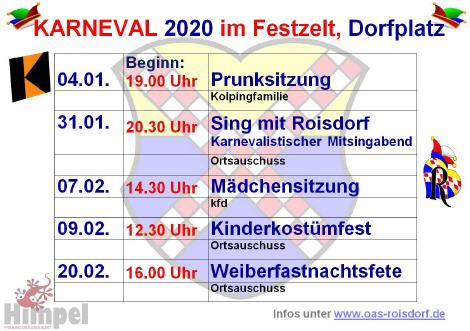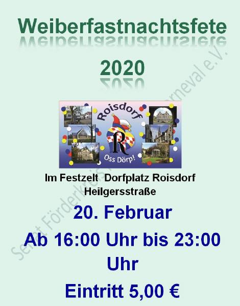 Ebenso am Donnerstag 20. Februar 2020 Weiberfastnachtsfete 2020 (After Zoch Party im Zelt mit Empfang der Roisdorfer Prinzessin 2020) Einlass ab 16:00 Uhr - 23:00 Uhr Ort: Festzelt Dorfplatz Heilgersstraße Roisdorf