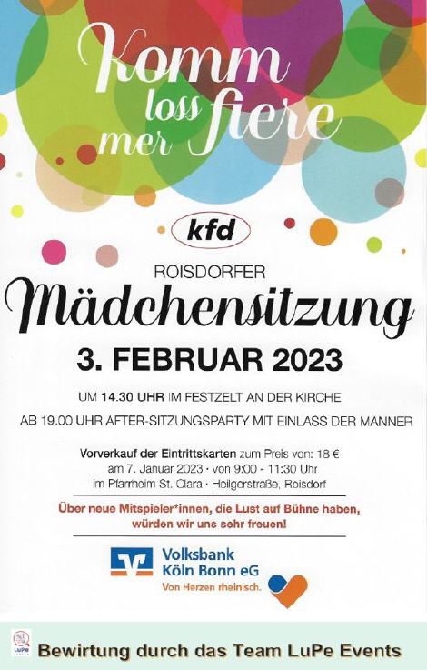 Macht mit im "Weiberfastnachtszug 2023" - Gemeinsame Ortsauschusssitzung mit den Zugteilnehmern am: Montag den 09. Januar 2023 Ort: Marktschänke Roisdorf Rosental 3 Beginn 19:00 Uhr (Geschlossene Gesellschaft Marktschänke geöffnet nur für...