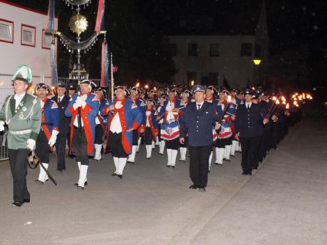 Meine kurzen Erklärungen zum Zapfenstreich zeigten Wirkung und so herrschte absolute Stille rund um die Kirche und Zelt. Es war ein tolles Bild als die große Abordnung mit mehr als 100 Teilnehemern, Musiker, Fackelträgern und Fahnenabordnungen der Roisdorfer Ortsvereine, auf den Platz einmarschierte. Geführt wurde der Zug von Schützenhauptmann Bernd Tönneßen.