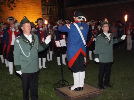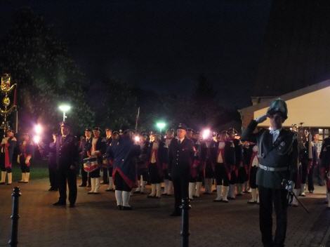 Nach Antreten, machte Hauptmann Bernd Tönneßen den Ehrengästen und Bürgermeister Hönig die Meldung „ Zapfenstreich angetreten“.