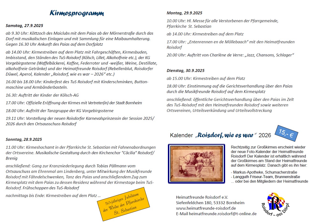 Auch in diesem Jahr wird die traditionelle Roisdorfer Großkirmes am vierten Wochenende im September auf dem Dorfplatz ausgerichtet.