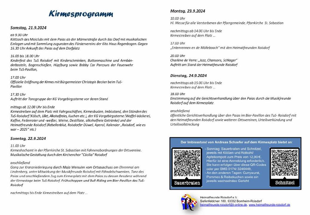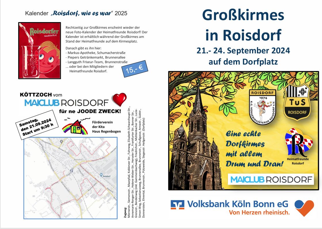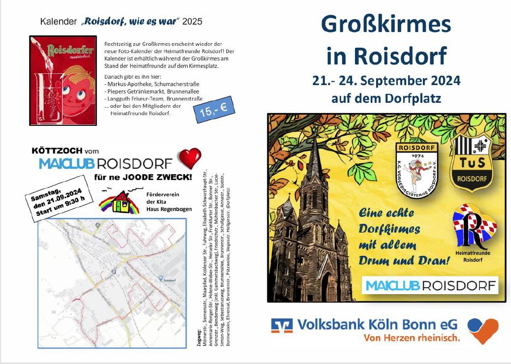 Auch in diesem Jahr findet wieder die traditionelle Roisdorfer Großkirmes am 4. Wochenende im September auf dem Dorfplatz statt.